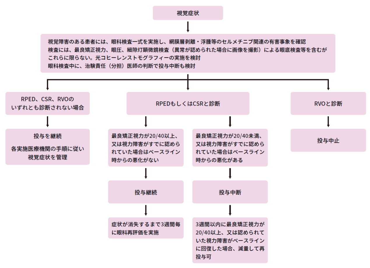視覚関連の有害事象はまれ*であるが、患者は3~6か月毎に眼底検査とOCTを含む眼科的評価を受けるべきである。低年齢の小児では、より頻回な評価が必要な場合もある。