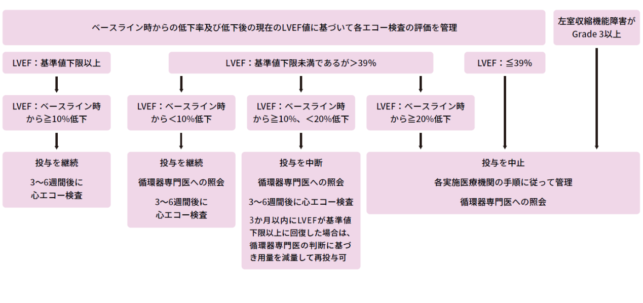 - 本剤投与開始前及び投与中は定期的に心機能検査(心エコー等)を行い、患者の状態(左室駆出率の変動を含む)を確認してください。