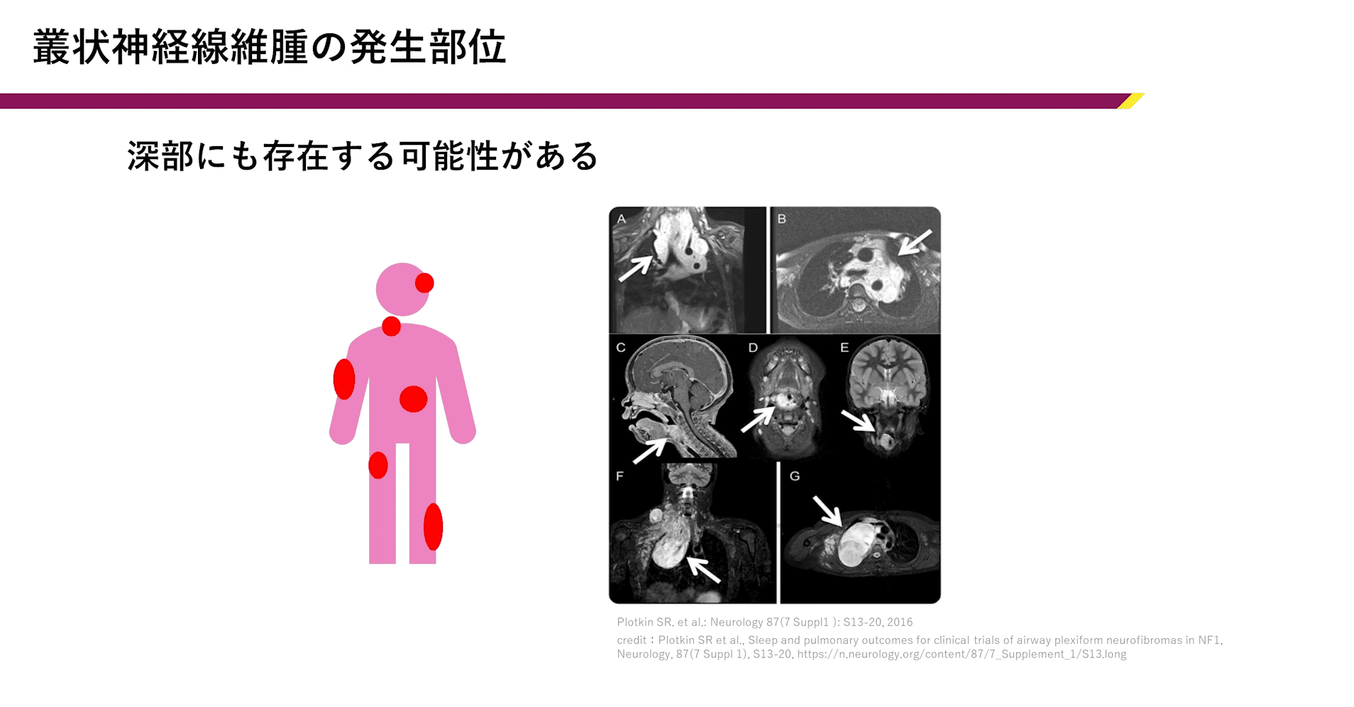 叢状神経線維腫の検出にあたっては、深部、つまり目に見えないところに腫瘍ができる可能性も考慮します。