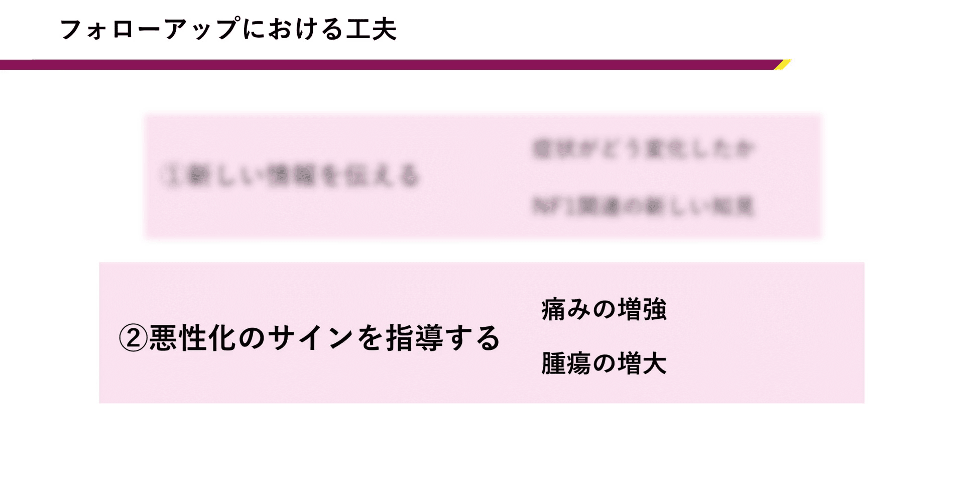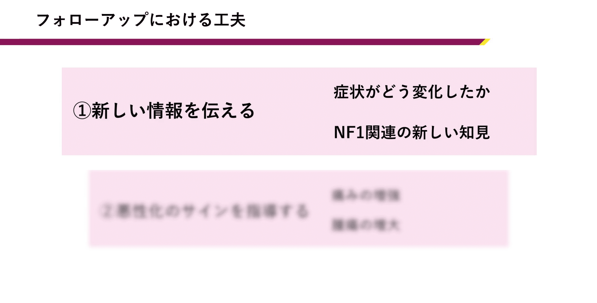 私が患者さんに伝える際の工夫として、例えば年1回の受診日にあわせ、前回から症状がどう変化したのか見えるように評価し、またその1年の間にNF1診療でどのような新しい知見が得られたのかを書面に示してお伝えするようにしています。