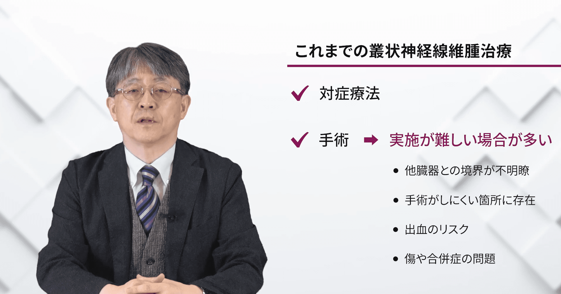 神経線維腫症1型において、最適な治療プランを構築するためには、叢状神経線維腫の存在を精査することが重要です。そこで、叢状神経線維腫へ注目する必要性や診療のポイント、日本人対象の臨床試験を中心としてコセルゴ®の基本情報について、大分大学の末延聡一先生にご解説いただきました。