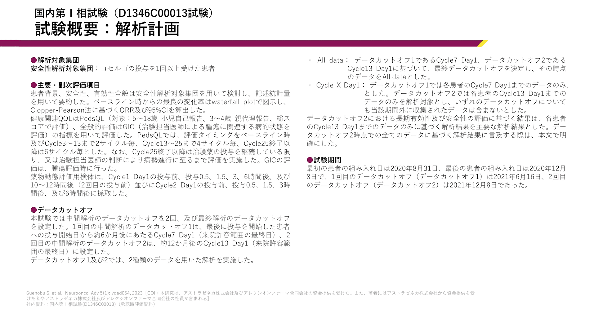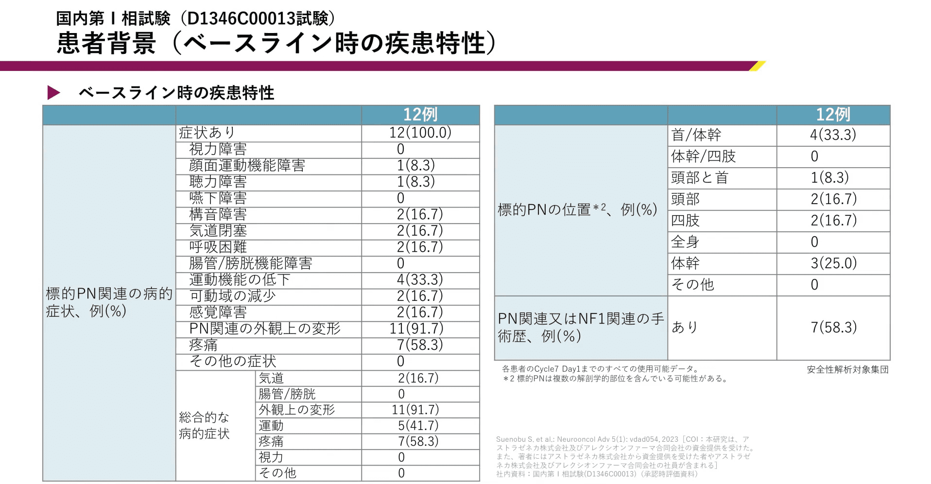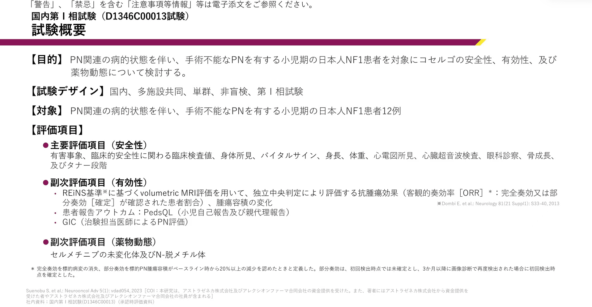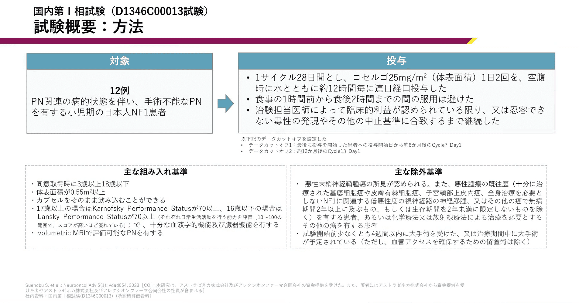 病的状態を伴う手術不能な叢状神経線維腫を有する小児期の日本人NF1患者さんを対象に、コセルゴ®を1日2回経口投与したときの有効性・安全性などが検討されました。
