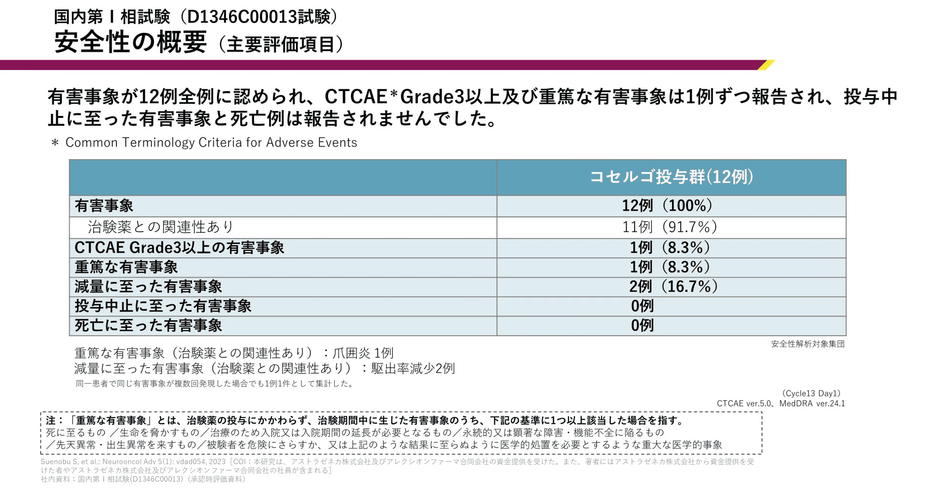 こちらは、コセルゴ®承認の根拠の一つとなった国内第Ⅰ相試験の概要です。