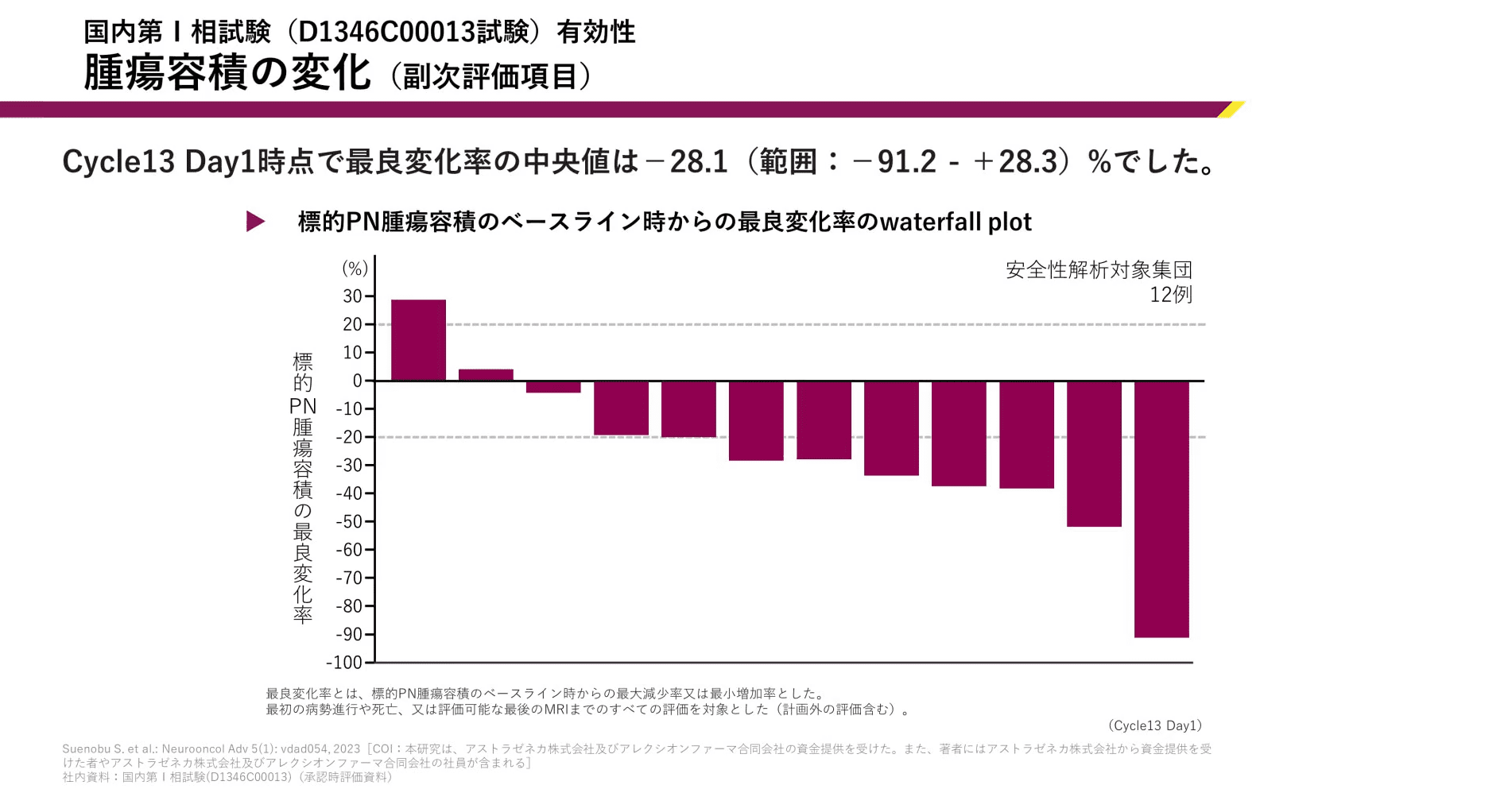 標的とする叢状神経線維腫の最良変化率の中央値は、-28.1%でした。