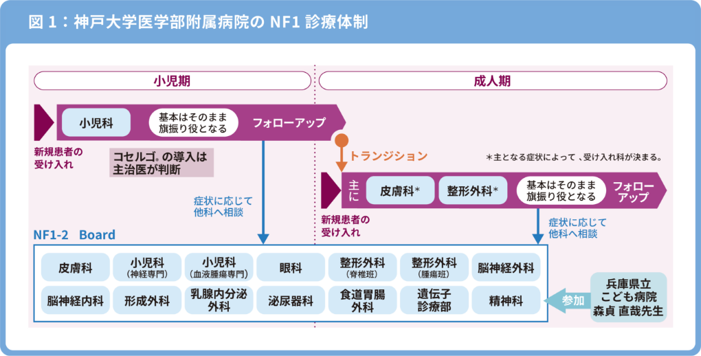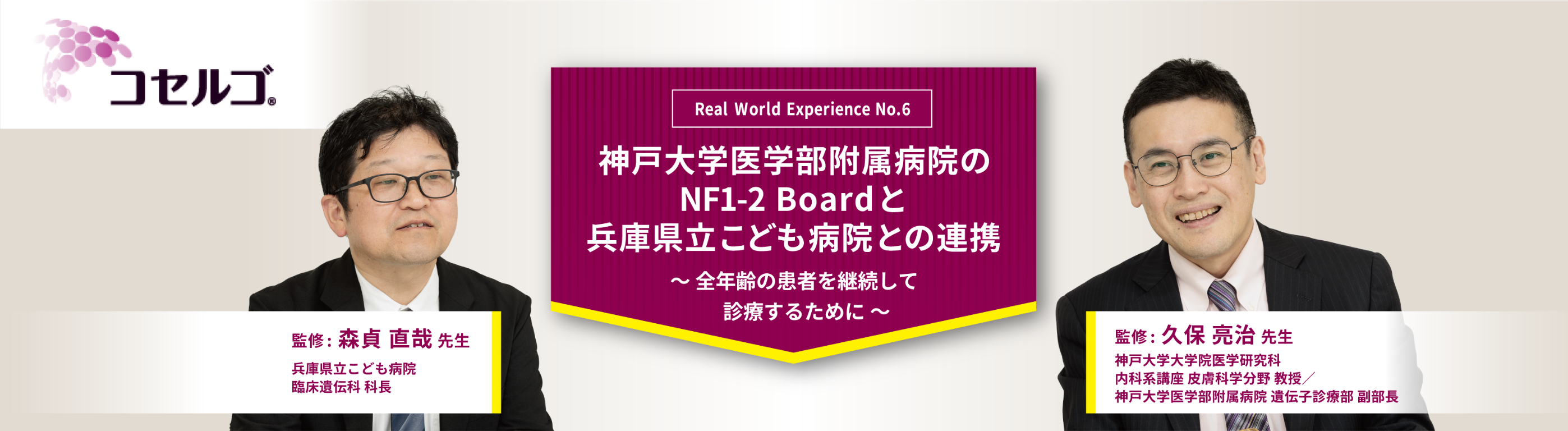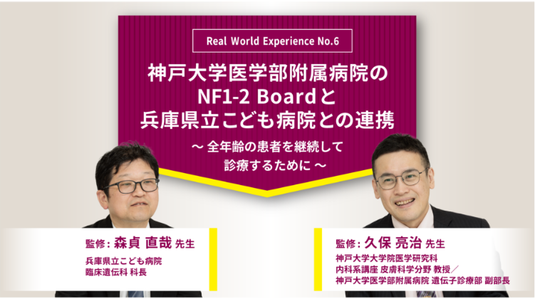 そこで今回は、神戸大学医学部附属病院でNF1-2 Boardを立ち上げられた久保亮治先生と、そのNF1-2 Boardにメンバーとして参加されている、兵庫県立こども病院の森貞直哉先生に、全年齢のNF1患者さんを継続して診療するための連携についてお話を伺いました。