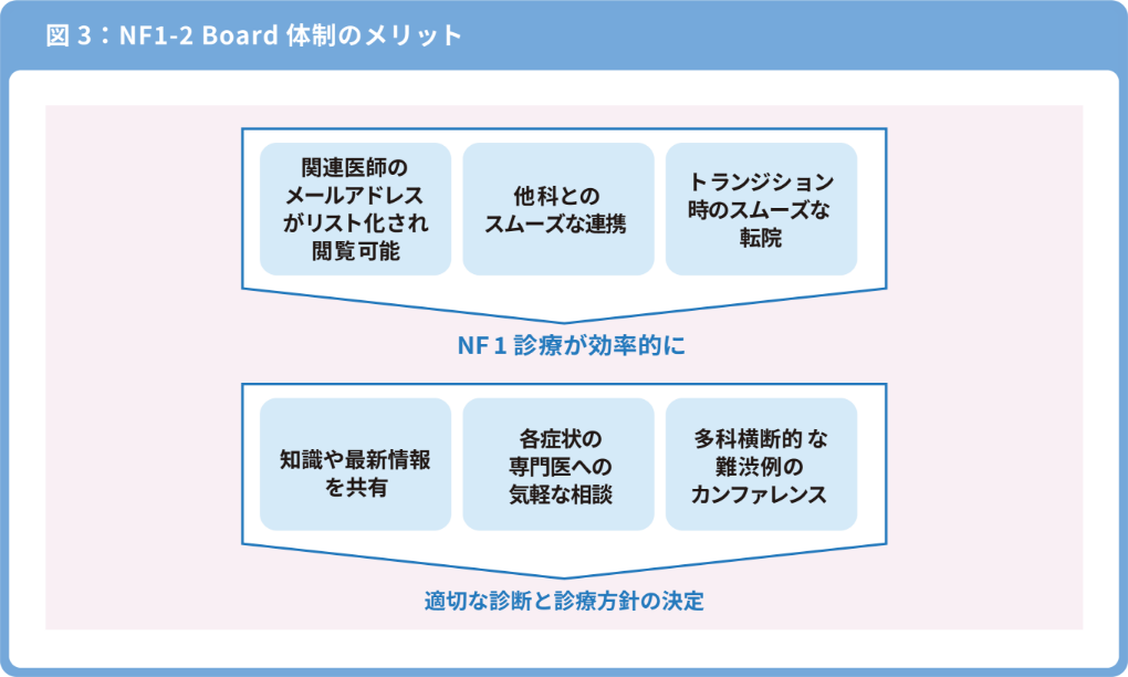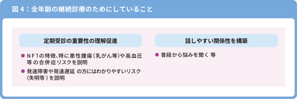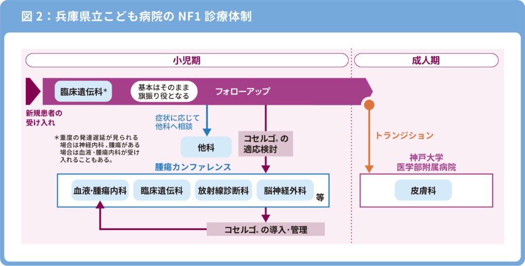 神経線維腫症1型(NF1)は皮膚症状をはじめとして、さまざまな臓器に多様な症状を呈する疾患です。そのため、1つの診療科でNF1患者さんを診療することは難しく、多科連携が欠かせません。また、NF1は成長とともに新たな症状があらわれるため、定期受診が非常に重要です。特に、成人期のNF1は悪性腫瘍のリスクが高まることが知られており1)、定期受診を中断することは患者さんの予後に影響する可能性があります。しかし、実際には診療科毎に別々で診療するため一人の患者さんを総合的に診ることが難しく、また、小児科から成人を対象とした診療科への移行(トランジション)がうまくできない、定期受診の重要性を理解していない等の理由で定期受診をしなくなる患者さんもいらっしゃいます。